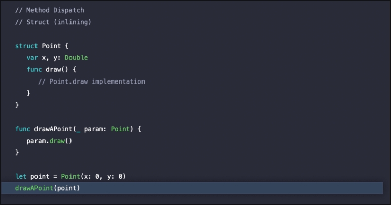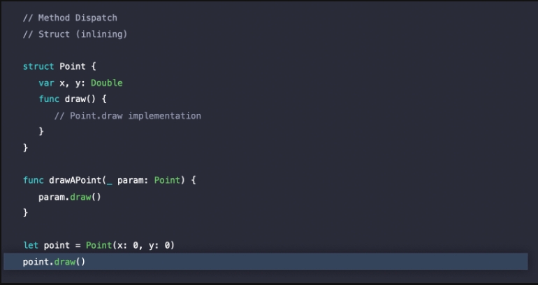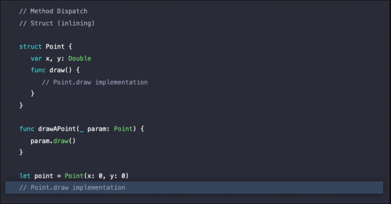 결론적으로 func draw() 안의 //Point.draw implementation으로 drawPoint(point)를 대체할 수 있다는 겁니다. 이게 메소드 인라이닝(Inlining)이에요.