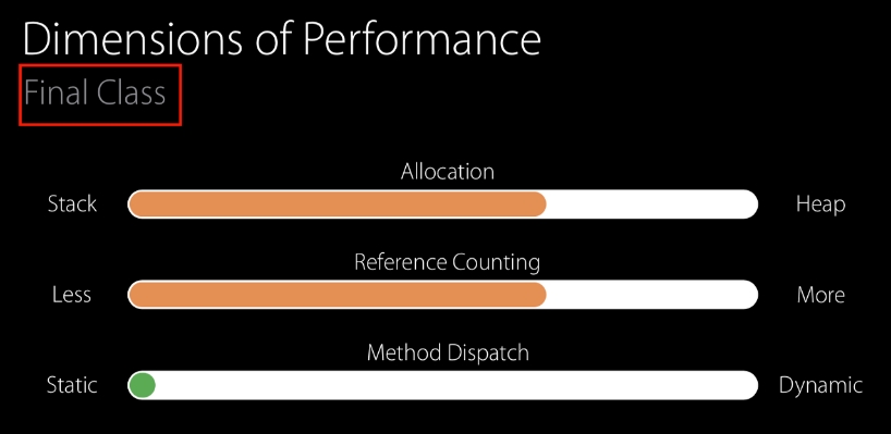 그렇지만, 항상 class는 dynamic dispatch만 사용해야 되는 것은 아닙니다. 위에서도 static dispatch는 값, 참조 타입 모두를 지원한다고 적어두었는데요. class 앞에 얘는 상속을 사용하지 않을 것이다는 final 키워드를 쓴다거나 private, fileprivate같은 접근 제어자를 사용해서 상속을 사용하지 않을 것임을 표시해둔다면 컴파일러는 해당 클래스가 static dispatch를 사용한다는 것을 알고 static dispatch로 전환하게 됩니다.