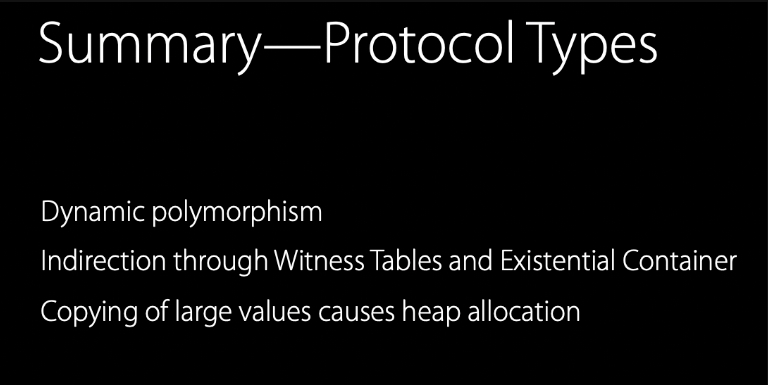 특수화 되지 않은 제네릭, 3 words 이하의 작은 값은 힙 할당 사용안함, 레퍼런스 카운팅도 없음, pwt를 통한 dynamic dispatch를 사용한다. 위에서 다 적진 않았습니다만 작은 값 같은 경우에는 existential container를 따로 만들지 않고 valueBuffer 3words를 사용합니다.