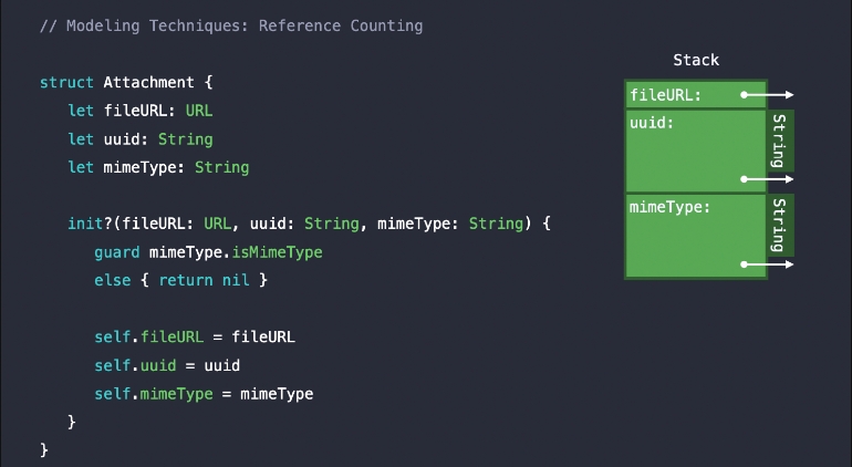 참조가 포함된 struct의 성능 개선을 진행해볼게요. 일단 아까 채팅방만들던 것을 예시로 이어가 보겠습니다. 채팅창에 텍스트말고 png, jpeg, gif 같은 것들도 보내고 싶습니다. 그러기 위해서 Attachment라는 struct를 생성했어요.