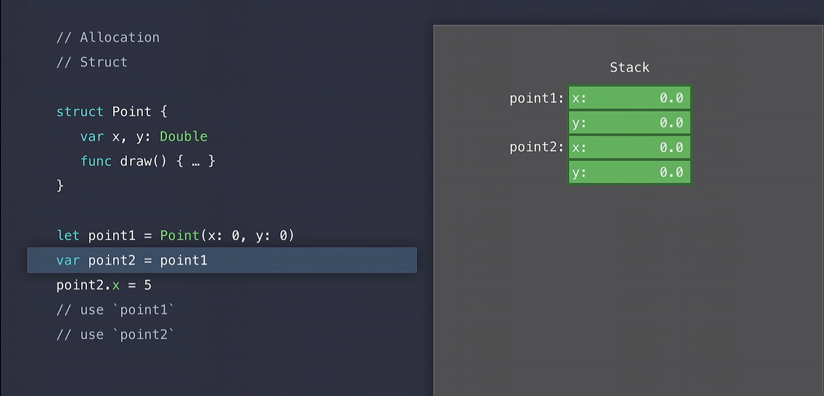 그리고 point1, point2는 독립적이기 때문에 point2가 변경되어도 point1에는 영향이 없고, 둘 다 사용이 끝나면 메모리에서 해제되죠.