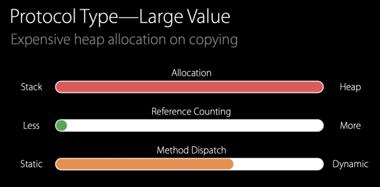 3 words 이상의 큰 값의 protocol type은 힙 할당을 사용한다. struct이므로 reference counting을 사용하진 않지만(class 프로퍼티가 있으면 사용하겠지), copy를 하게 되면 힙도 같이 복사되어버리므로 큰 비용이 발생한다. method dispatch는 pwt를 기반으로 한 dynamic dispatch를 사용한다.