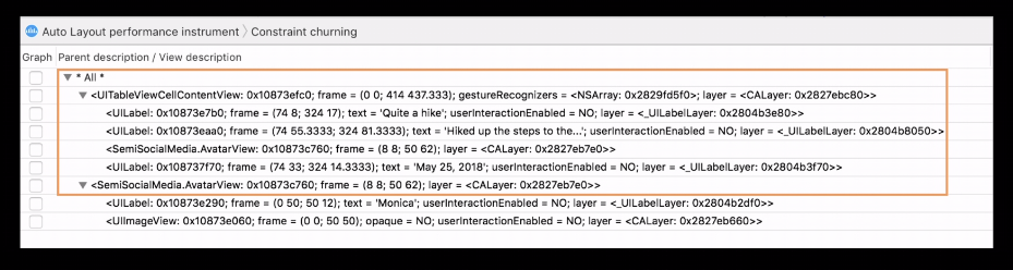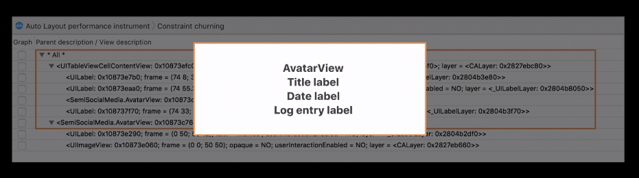 이 부분의 상세보기를 확인해보면 두번째, 세번째 사진과 같습니다. 여기서는 어떤 것들에 대해서 영향을 받는지 관련된 뷰의 목록이 표시됩니다. UITableViewCellContentView 안에 4개의 뷰가 있고 그 4개의 뷰인 AvaterView, Title label, Date label, Log entry label이 있습니다. 여기서 뭔가 이슈가 있나봐요.