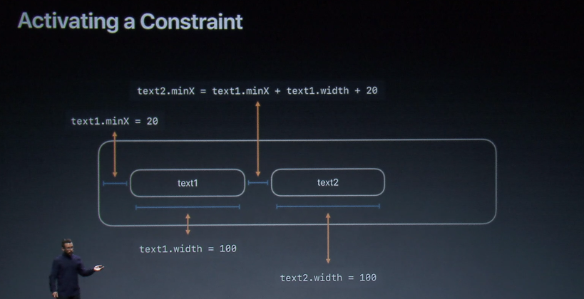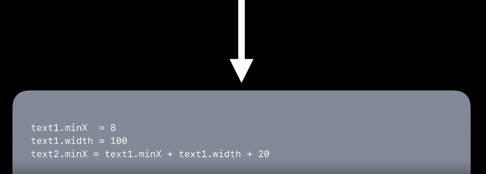 그리고 나서 이제 엔진에서 연산을 시작할 겁니다. 첫번째는 text.minX가 들어옵니다(8이 아니라 20). 다음으로 text1.width = 100이 들어오고, 이어서 text2.minX가 들어옵니다.