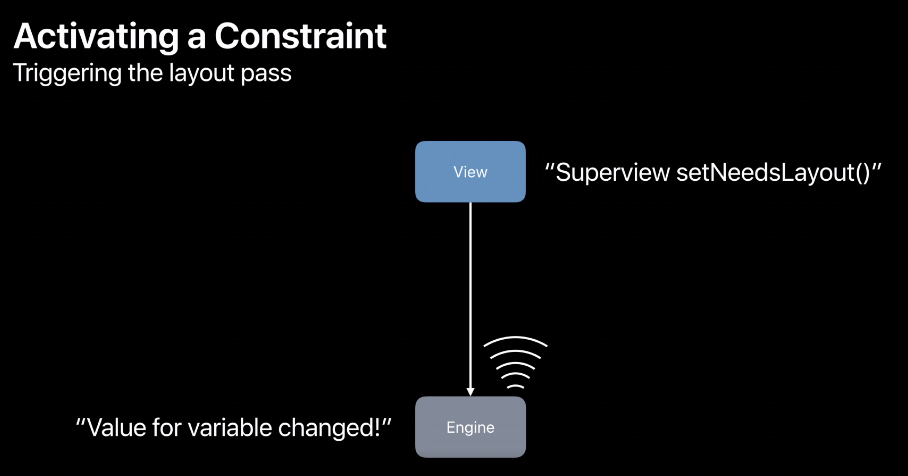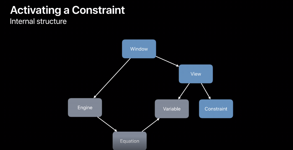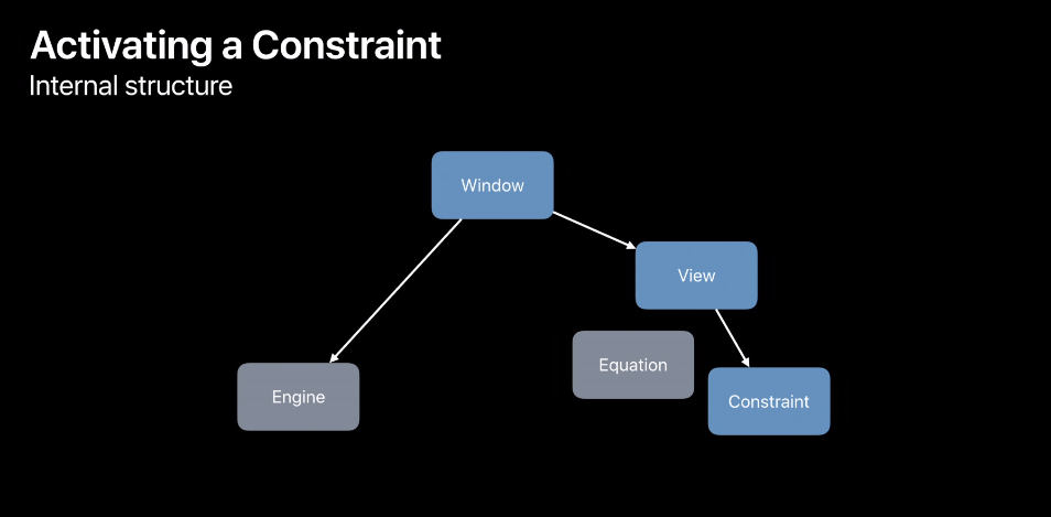 아래의 그림이 간략한 다이어그램 입니다. View에서 제약 조건을 추가한다면 이 View는 Window에 달려있죠. 그리고 Window에 매달려 있는 것이 Engine이라는 내부의 개체입니다. Engine은 Auto Layout의 컴퓨팅 코어이죠. 그리고 이제 다음으로 Constraint가 추가되면, Constraint에 해당하는 방정식(Equation)을 만들고 그것을 엔진에 추가합니다.