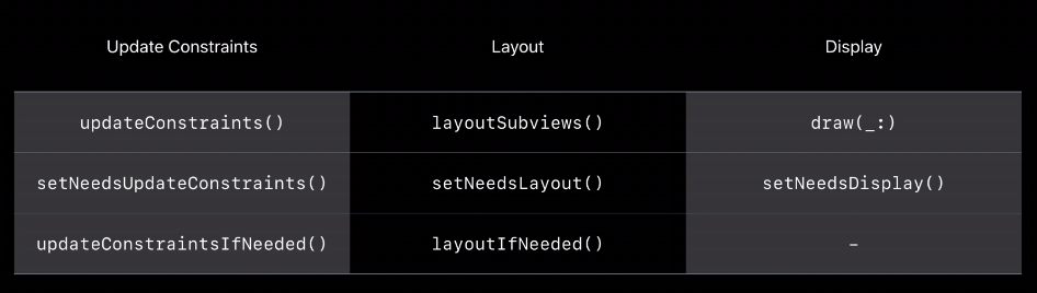 -IfNeeded 는 반대로 당장 필요하다는 겁니다. 뭐가? updateConstraints(), layoutSubviews()가요. 저 메소드가 실행되는 즉시 updateConstraintsIfNeeded()라면 updateConstraints()가 호출될 것이고, layoutIfNeeded()라면 layoutSubviews()가 호출되겠죠.