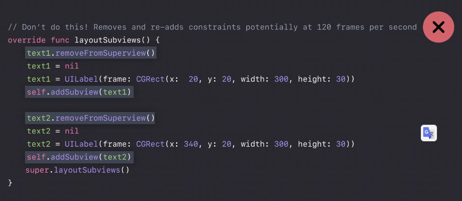 이것은 마치 layoutSubviews()가 호출될 때마다 모든 Subview를 파괴하고, 처음부터 만든 다음 다시 추가하는 것과 똑같습니다. 첫번째 그림처럼 말이죠.
