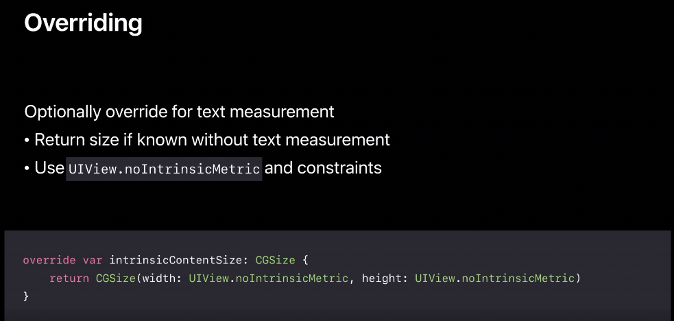 Intrinsic Content Size는 대체로 오버라이드하지 않지만, 텍스트의 크기가 고정되어 있어 텍스트 특정이 필요하지 않은 경우에만 오버라이드 합니다.