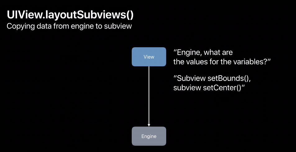 그러면 뷰는 엔진이 값을 알려줬으니 해당 뷰의 superview를 호출하고 해당 하위 뷰의 setCenter에서 setBounds를 호출합니다.