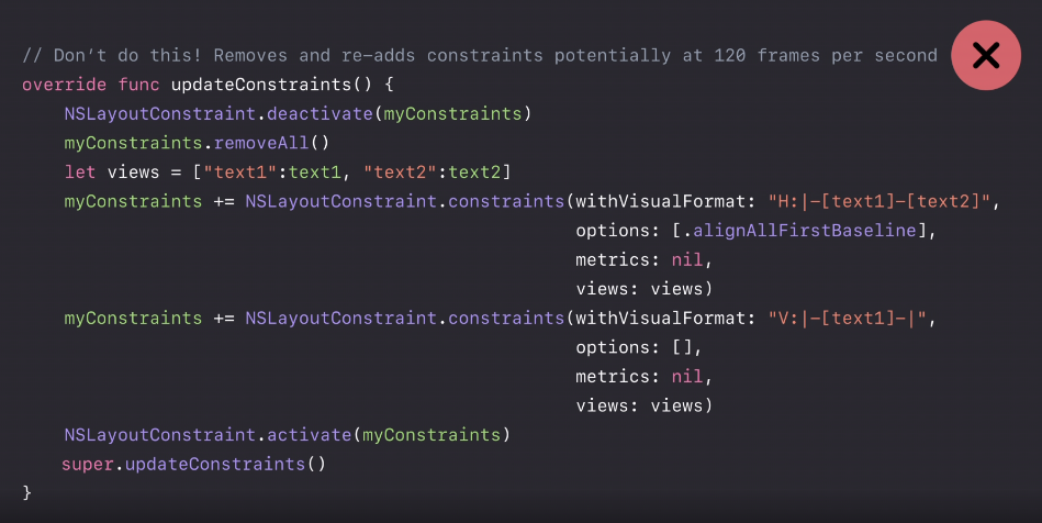 대신에 우리가 할 수 있는 것은 설정된 글꼴 내에서 setNeedsUpdateConstraints를 호출하는 겁니다. 그러면, 프레임이 스크린으로 이동하기 전에 끝에서 updateConstraints을 호출하게 됩니다. 초당 120번씩 updateConstraints를 실행하지 않고 마지막에만 딱 1번 호출하는 것이죠.